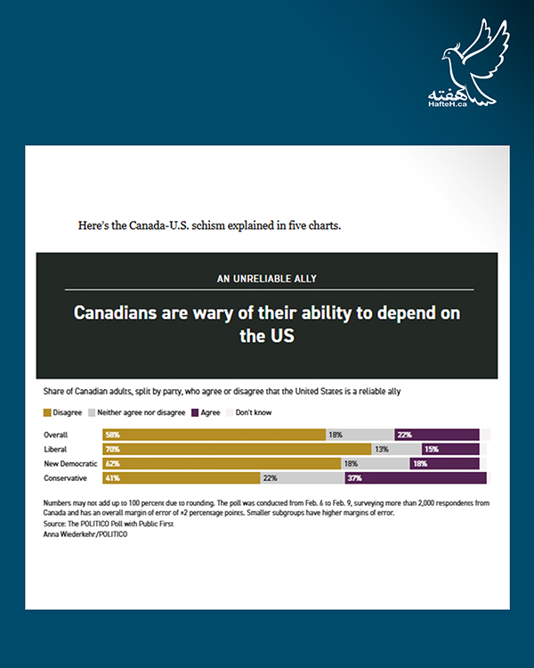کاناداییها دیگر آمریکا را تنها یک مزاحمت نمیبینند؛ آنها معتقدند ارزشها و رفتار آمریکا دیگر با کانادا هماهنگ نیست و احتمال ایجاد تنش و بحران بیشتر از پیشگیری از آن وجود دارد. بر اساس نظرسنجی، ۵۸ درصد کاناداییها معتقدند آمریکا در بحرانها قابل اعتماد نیست و ۶۷ درصد میگویند این کشور بیشتر متحدان خود را به چالش میکشد تا حمایت. همچنین ۶۹ درصد پاسخدهندگان معتقدند آمریکا بیشتر باعث ایجاد مشکل برای دیگر کشورها میشود تا حل آن.