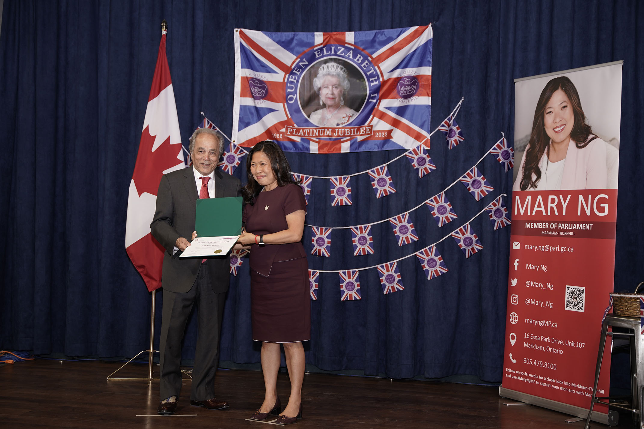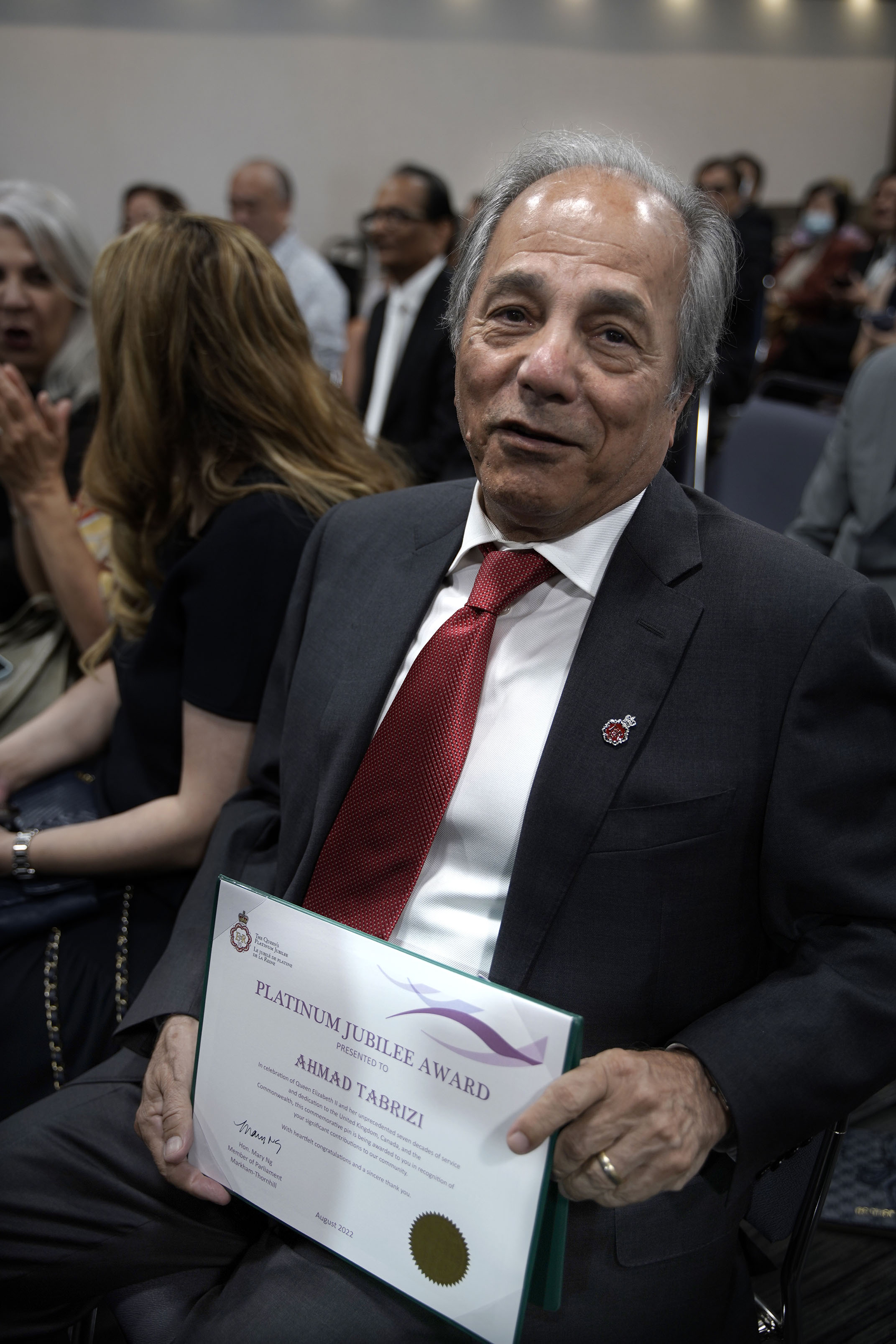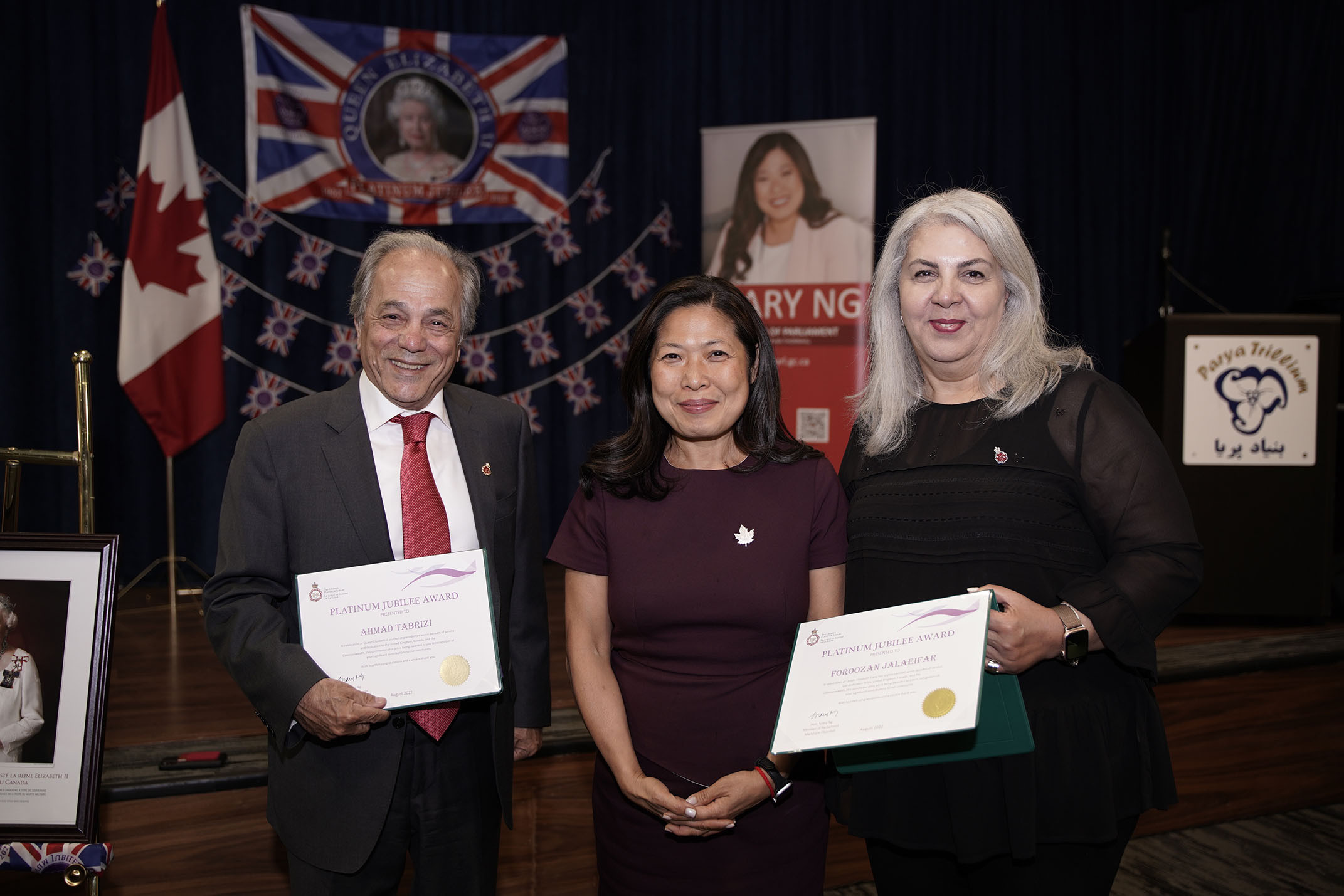 به گزارش خبرنگار هفته مراسم مربوط به اهدای این نشانها در بنیاد پریا با حضور خانم مری نگ وزیر تجارت بینالملل، توسعه اقتصادی و مشاغل کوچک دولت کانادا برگزار شد و احمدرضا تبریزی، مدیر بنیاد پریا و فروزان جلالی فر، مدیر داخلی این بنیاد به همراه چند ده نفر دیگر نشان پلاتینی (Queen’s Platinum Jubilee) را از خانم وزیر دریافت کردند.