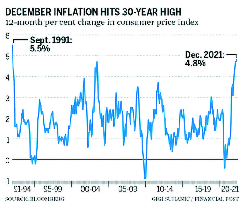 اداره آمار کانادا در انتهای سال گذشته با استفاده از دادههای مربوط به تورم و شاخص قیمت مصرف نرخ بهره را محاسبه میکند. تمام هشت معیار اصلی که اداره آمار بهوسیله آن کالاها و خدمات را دستهبندی میکند نشان از این دارند که تورم در ماه دسامبر گذشته به قلهای بیسابقه در سیسال گذشته رسیده است. عوامل اقتصادی تنها دلیل این افزایش قیمتها نیستند. بهعنوان مثال در گزارشی که اداره آمار در نوزدهم ژانویه منتشر کرد آمده است که قیمت مواد غذایی نسبت به سال گذشته حدود پنج و دو دهم درصد افزایشیافته است که یکی از عوامل آن مربوط به آبوهوای نامساعد در برخی از بخشهای حاصلخیز در سطح دنیاست که باعث افزایش قیمت میوه شده است. قیمت گندم و غلات نیز در پی خشکسالی نواحی مرکزی کانادا در تابستان گذشته افزایش یافت. از همین دست میتوان به قیمت میوه اشاره کرد که امسال در ایالات متحده بیشتر از سال گذشته بود. باتوجهبه بیماری خاصی به نام citrus greening که در فلوریدا و در میان درختان پرتقال منتشر شد کیفیت و کمیت محصول در این ایالت مانند قبل نبود. همین کمبود محصول و کاهش عرضه باعث شد ارزش آبپرتقال در بازارهای بورس آمریکا – عمدتاً در بازار بورس کالای شیکاگو – بهشدت بالا برود. قیمت گوشت قرمز نیز حدود دوازده درصد بیشتر از سال قبل به مشتریان عرضه شد. نرخ افزایش قیمت لوازم منزل به دلیل عدم هماهنگی در زنجیره عرضه کالا بعد از اوج بحران همهگیری، به حدود نه درصد رسیده که از سال ۱۹۸۲ تا کنون بیسابقه است. هم اکنون شاخص قیمت مصرفکننده تا حدود یکدهم درصد نسبت به ماه نوامبر کاهشیافته ولی یکی از دلایل آن را میتوان به کاهش روند رشد قیمت بنزین دانست، هرچند که بسیار کم بود و بسیاری آن را حتی احساس نکردند. قیمت سوخت هنوز نسبت به نوامبر سال ۲۰۲۰ حدود سی و سه درصد بیشتر است. درعینحال به جز انرژی، شاخص قیمت در مورد بقیه اقلام تورم نسبت به سال گذشته حدود سه و هشت دهم درصد افزایش یافت که رقم چندان بزرگی نیست. پیشبینی میشود که با وضع قوانین منع رفتوآمد کامیوندارانی که واکسن نزدهاند، در آینده نزدیک قیمت کالاهای وارداتی از جمله غذا از ایالات متحده آمریکا از این هم که هست بالاتر برود.