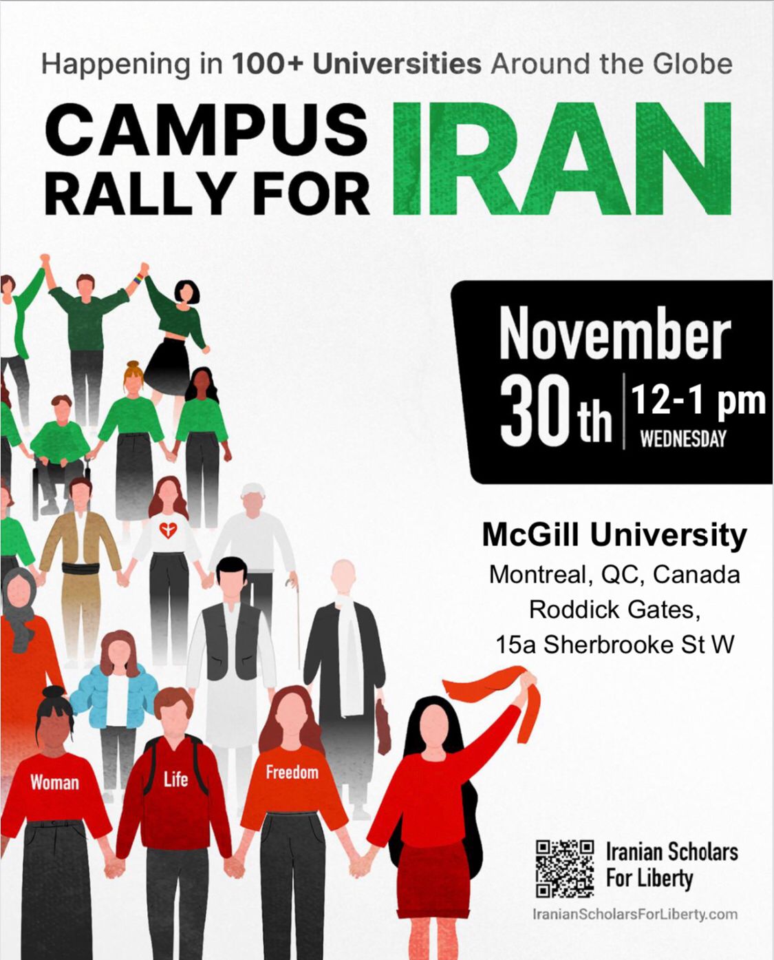 در اطلاعیه انجمن دانشجویان ایرانی دانشگاه مکگیل آمده است: «این چهارشنبه برای اولینبار بیش از ۱۵۰ دانشگاه در سراسر دنیا برای CampusRallyforIran گرد هم میآیند تا از ایرانیهای شجاع و مبارز که برای آزادی میجنگند حمایت خود را نشان دهند. از تمام شما دوستان درخواست میکنیم که با همراهی با دیگر دانشگاهیان در این تجمع شرکت کنید و برنامه را با دوستانتان به اشتراک بگذارید.»