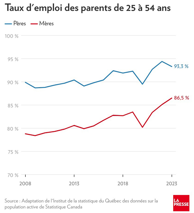 طبق گزارش اداره آمار کبک، نرخ اشتغال مادران در این استان در ۱۵ سال اخیر بهسرعت افزایش یافته و از ۷۹ درصد در سال ۲۰۰۸ به ۸۷ درصد در سال ۲۰۲۳ رسیده است. رشد اشتغال در میان مادرانی که کوچکترین فرزندشان زیر ۶ سال دارد، سرعت بیشتری داشته و از ۷۲ درصد در سال ۲۰۰۸ به ۸۲ درصد در سال ۲۰۲۳ رسیده است.