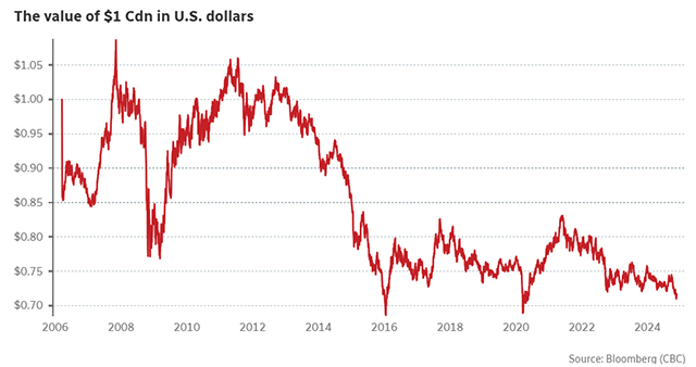 کارل شاموتا، استراتژیست ارشد شرکت مالی Corpay، پیشبینی کرده که دلار کانادا ممکن است حتی به ۶۸ سنت آمریکا نیز برسد. ضعف دلار کانادا تأثیرات گستردهای بر اقتصاد این کشور دارد؛ ازجمله افزایش هزینه واردات و سود بیشتر برای صادرکنندگانی که درآمدشان به دلار آمریکا محاسبه میشود.