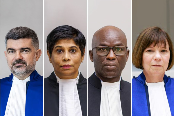از چپ به راست: نیکلا گیو، قاضی دیوان کیفری بینالمللی از فرانسه؛ نزحت شمیمخان، معاون دادستان از فیجی؛ مام ماندیایه نیانگ، معاون دادستان از سنگال؛ و کیمبرلی پروست، قاضی از کانادا در این تصویر ترکیبی نمایش داده شدهاند. هر چهار نفر توسط ایالات متحده آمریکا تحریم شدهاند. (icc-cpi.int)