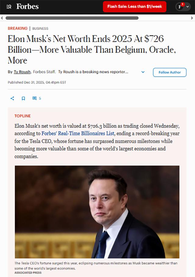 بر اساس فهرست لحظهای میلیاردرهای مجله فوربز، ثروت خالص ایلان ماسک در پایان معاملات روز چهارشنبه و در آخرین روزهای سال ۲۰۲۵ به ۷۲۶ میلیارد و ۳۰۰ میلیون دلار رسید. هرچند سهام تسلا در آن روز با افت یکدرصدی مواجه شد و ۳.۳ میلیارد دلار از دارایی او کاست، اما این کاهش جزئی نتوانست مانع ثبت یکی از شگفتانگیزترین سالها در تاریخ ثروتهای فردی شود.